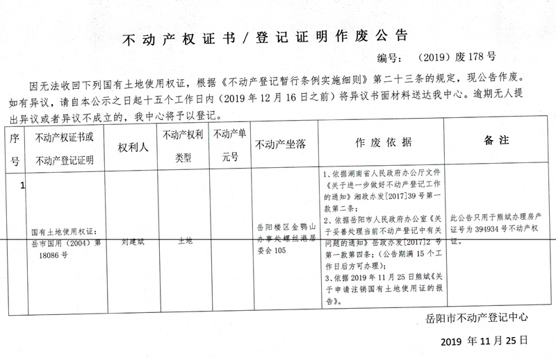 不动产权证书、登记证明作废公告 编号: (2019)废178号(刘建斌,国有土地使用权证岳市国用(2004)第18086号)
