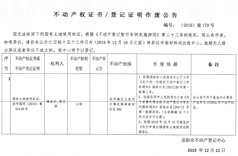 不动产权证书、登记证明作废公告 编号: (2019)废179号(谢金沙、彭文军,国有土地使用权证岳市国用(2015)第S2119号)