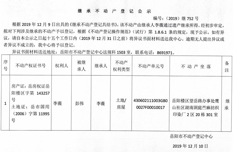 继承不动产登记公示 编号:(2019)继752号(李薇)