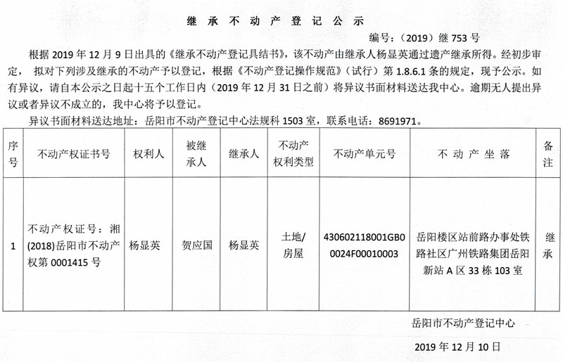继承不动产登记公示 编号:(2019)继753号(杨显英)