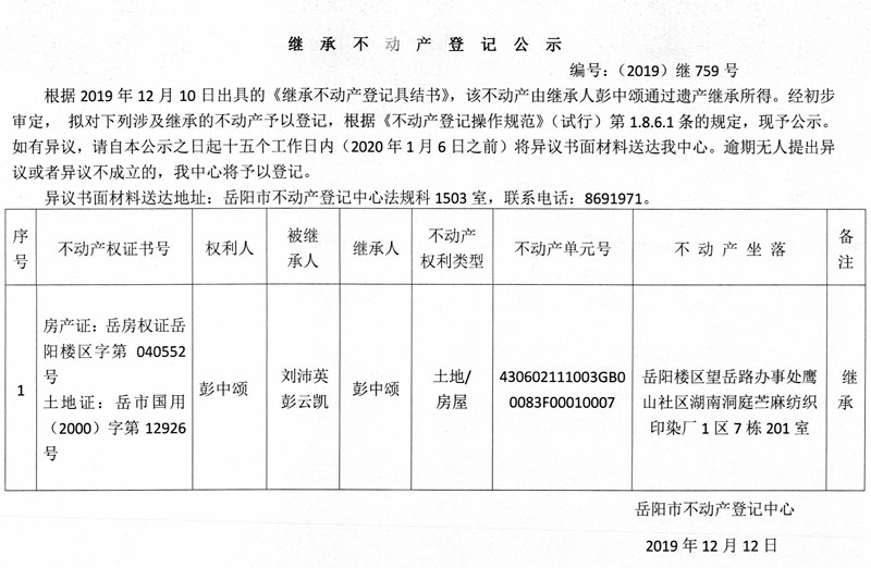 继承不动产登记公示 编号:(2019)继759号(彭中颂)