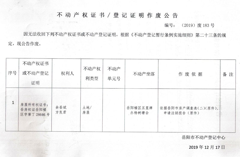 不动产权证书、登记证明作废公告 编号: (2019)废183号(余岳斌、方良君,房屋所有权证号岳房权证岳阳楼区字第丁28646号)