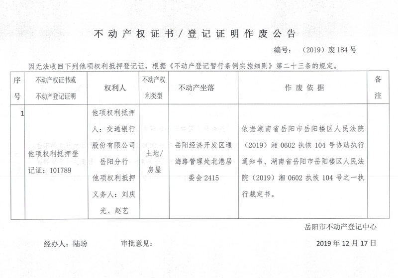 不动产权证书、登记证明作废公告 编号: (2019)废184号(他项权利抵押人交通银行股份有限公司岳阳分行,他项权利抵押义务人刘庆光、赵艺,他项权利抵押登记证101789)