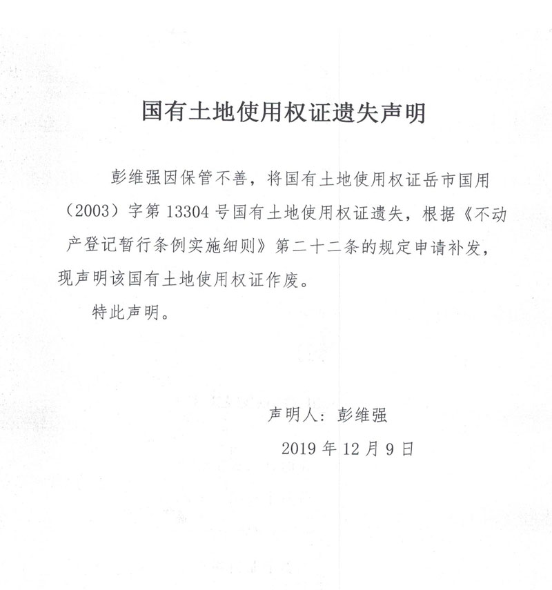 国有土地使用权证遗失声明(彭维强,国有土地使用权证岳市国用(2003)字第13304号)