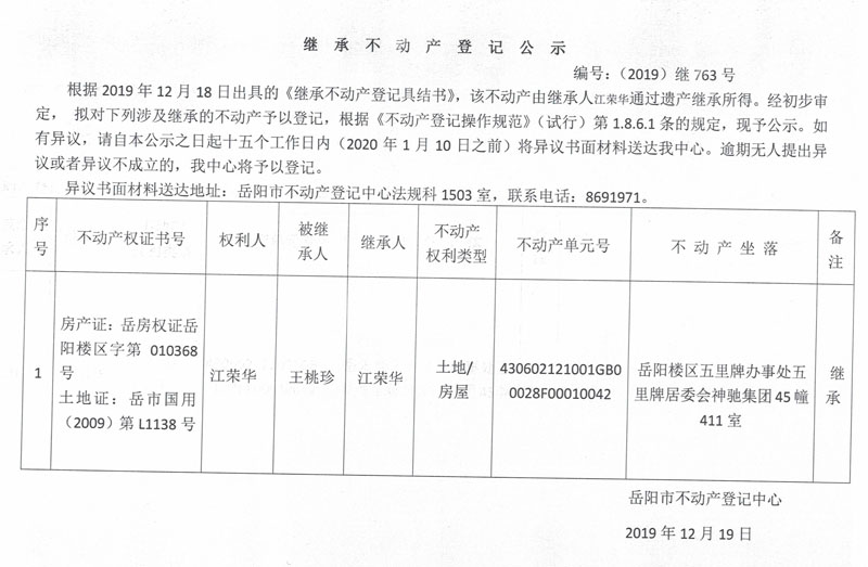 继承不动产登记公示 编号:(2019)继763号(江荣华)
