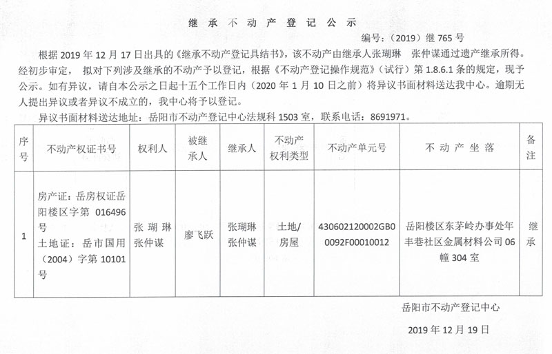 继承不动产登记公示 编号:(2019)继765号(张仲谋)