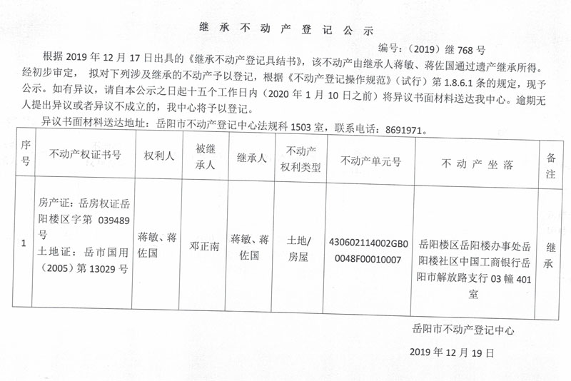 继承不动产登记公示 编号:(2019)继768号(蒋敏)