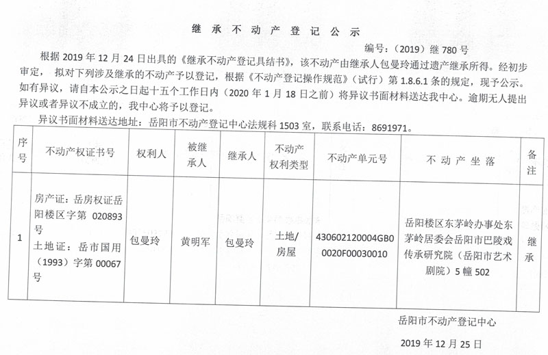 继承不动产登记公示 编号:(2019)继780号(包曼玲)