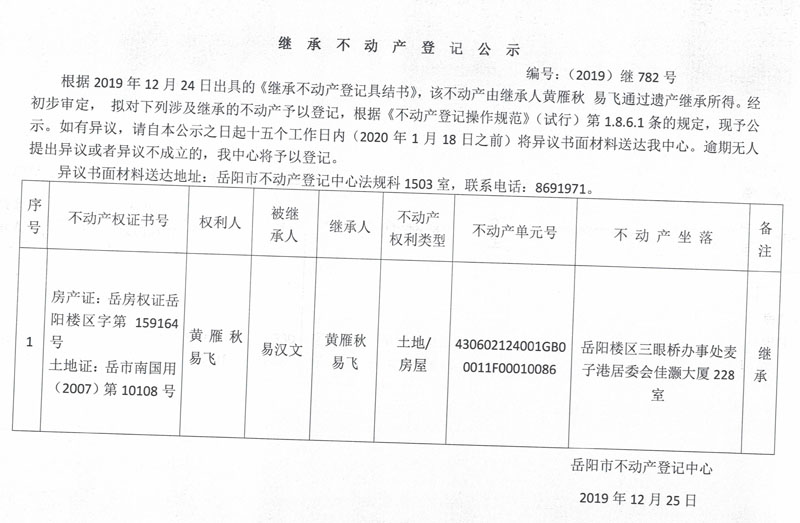 继承不动产登记公示 编号:(2019)继782号(易飞 )