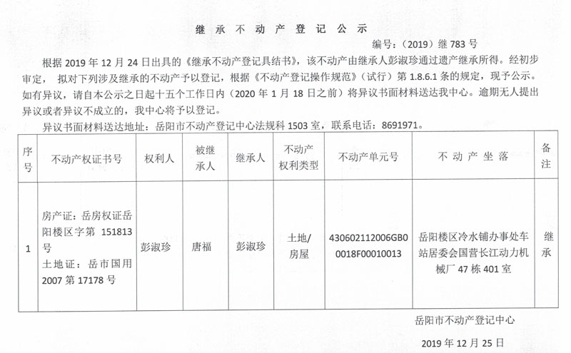 继承不动产登记公示 编号:(2019)继783号(彭淑珍 )