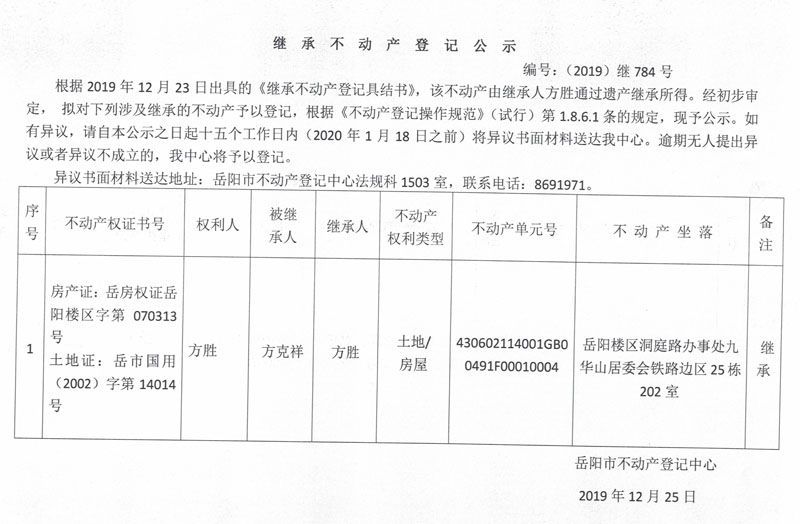 继承不动产登记公示 编号:(2019)继784号(方胜 )