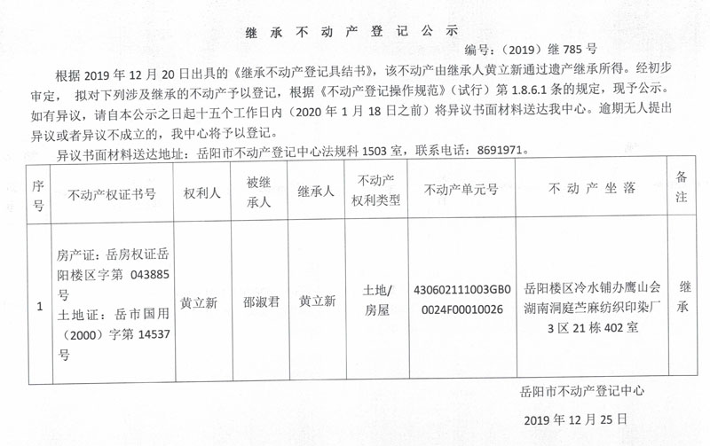 继承不动产登记公示 编号:(2019)继785号( 黄立新)