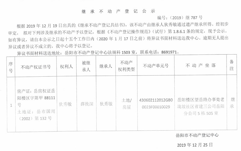 继承不动产登记公示 编号:(2019)继787号( 狄秀敏)