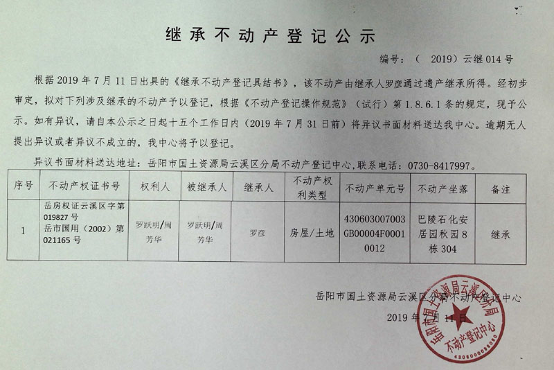 继承不动产登记公示 编号(2019)云继014号(罗跃明、周芳华)