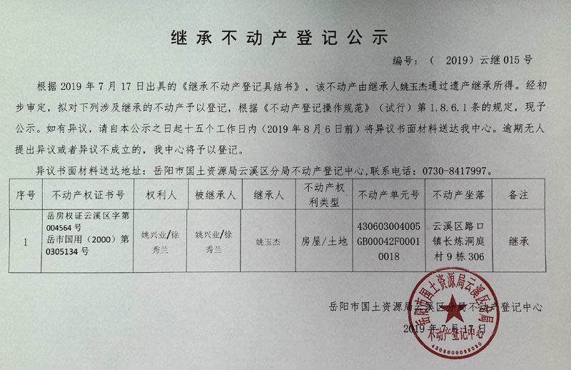 继承不动产登记公示 编号(2019)云继015号(姚兴业、徐秀兰)