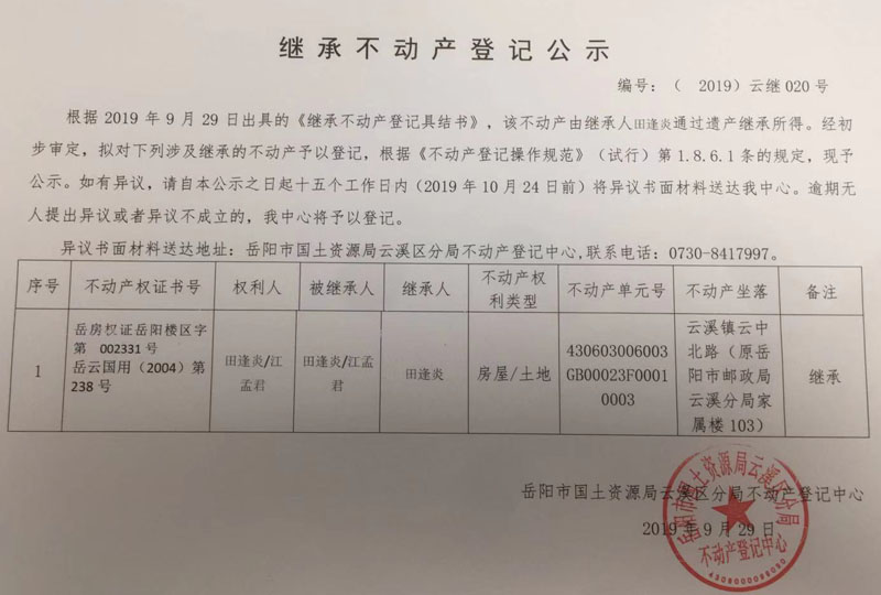 继承不动产登记公示 编号(2019)云继020号(田逢炎、江孟君)