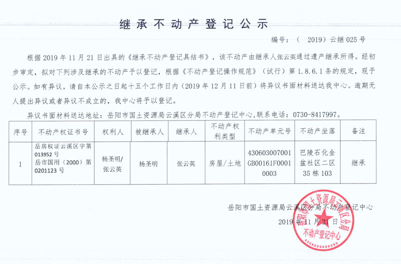 继承不动产登记公示 编号(2019)云继025号(杨圣明、张云英)