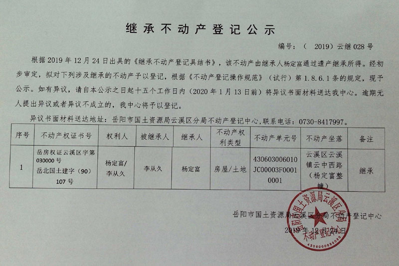 继承不动产登记公示 编号:(2019)云继028号(杨定富、李从久)