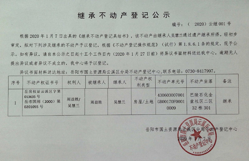 继承不动产登记公示 编号:(2020)云继001号(周益胜、吴慧兰)