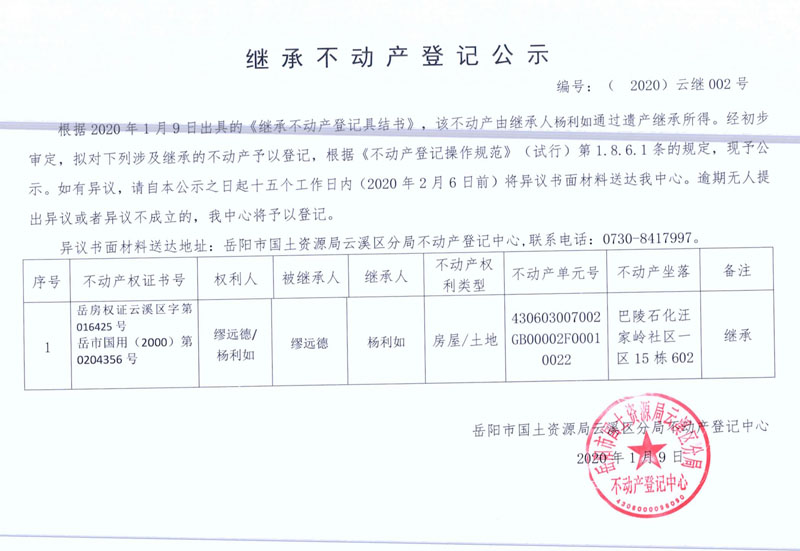 继承不动产登记公示 编号:(2020)云继002号(缪远德、杨利如)