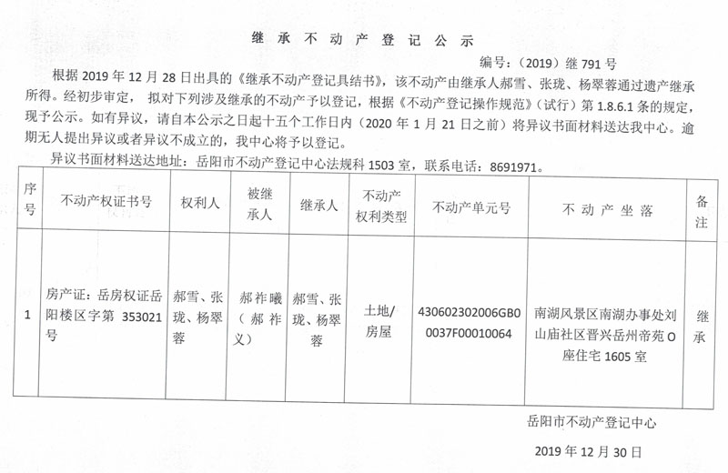 继承不动产登记公示 编号:(2019)继791号(郝雪)