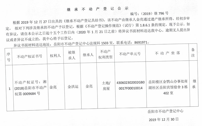 继承不动产登记公示 编号:(2019)继796号(金亮)