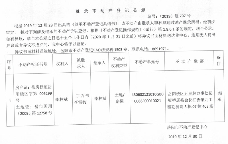 继承不动产登记公示 编号:(2019)继797号(李林斌)