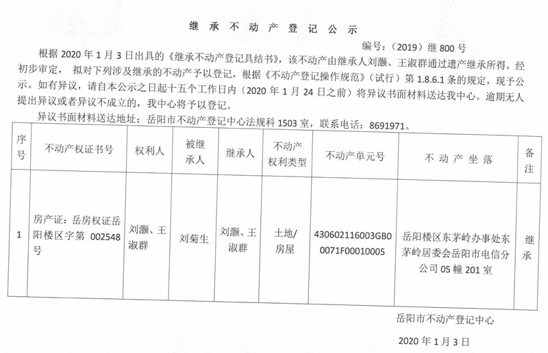 继承不动产登记公示 编号:(2019)继800号(王淑群)