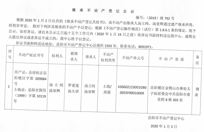 继承不动产登记公示 编号:(2019)继792号(汤亚辉)