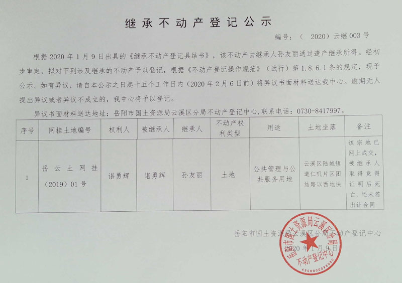 继承不动产登记公示 编号:(2020)云继003号(孙友丽)