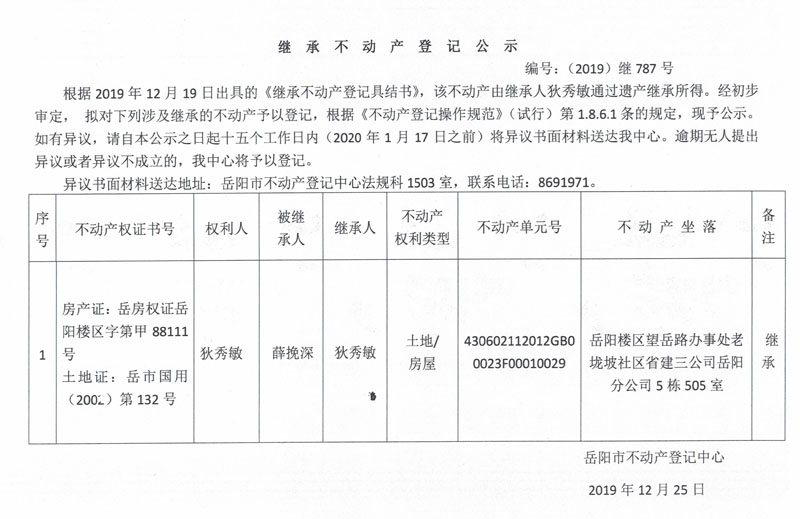 继承不动产登记公示 编号:(2019)继787号(狄秀敏)