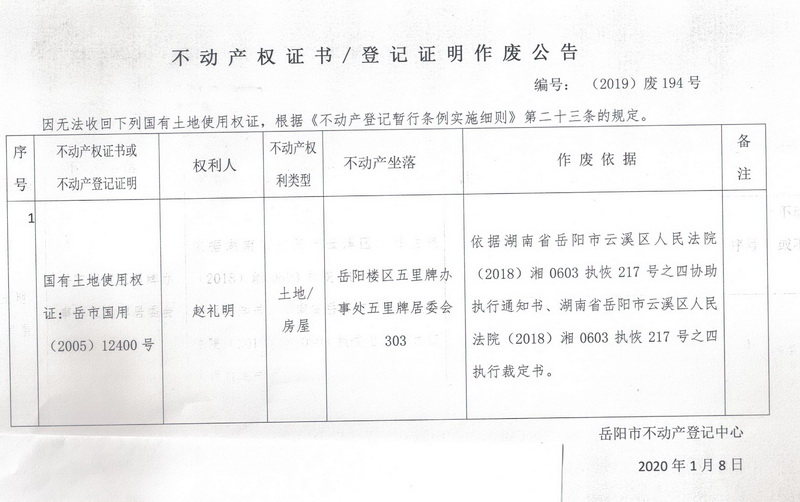 不动产权证书、登记证明作废公告 编号: (2019)废194(赵礼明,土地证岳市国用(2005)12400)