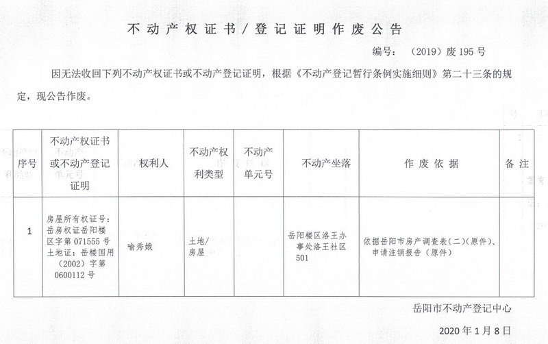 不动产权证书、登记证明作废公告 编号: (2019)废195(喻秀娥,房屋所有权证号岳房权证岳阳楼区字第071555号,土地证岳楼国用(2002)字第0600112)