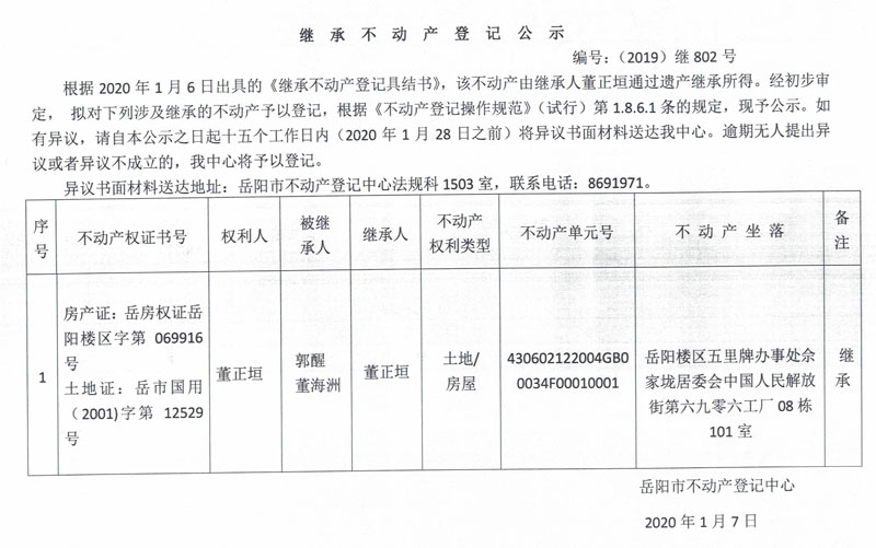 继承不动产登记公示 编号:(2019)继802号(董正垣)