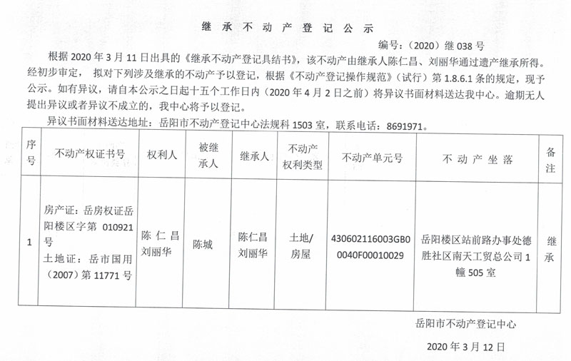 继承不动产登记公示 编号:(2020)继038号(刘丽华)