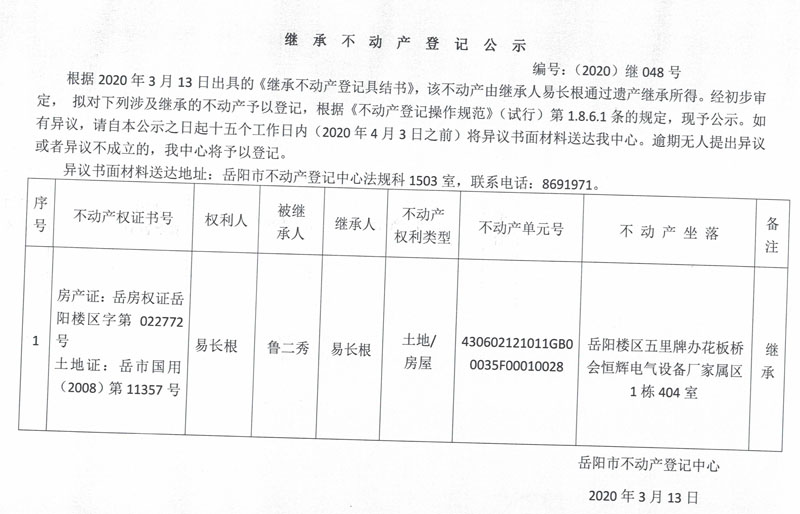 继承(受遗赠)不动产登记公告(易长根)