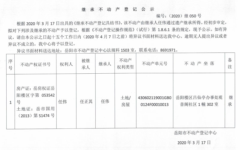 继承(受遗赠)不动产登记公告(任伟)