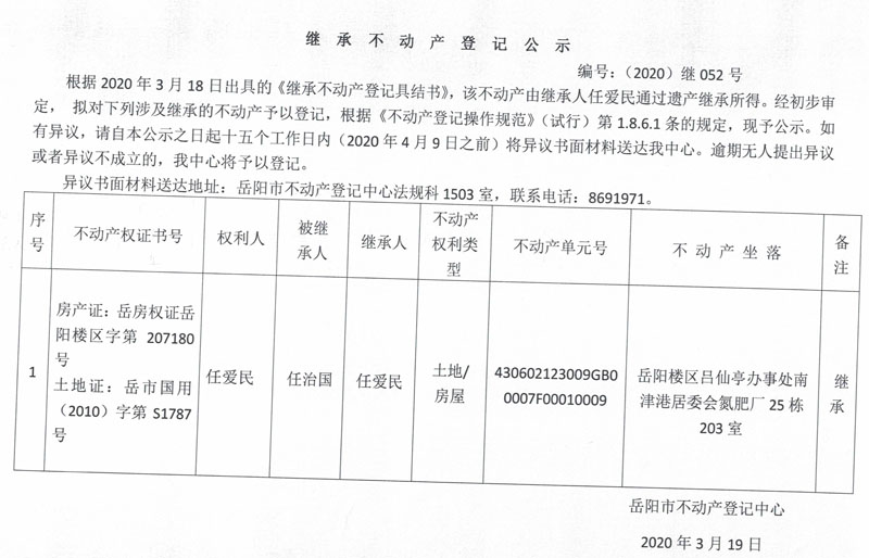 继承(受遗赠)不动产登记公告(任爱民)