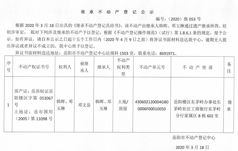 继承(受遗赠)不动产登记公告(邓玉琳)