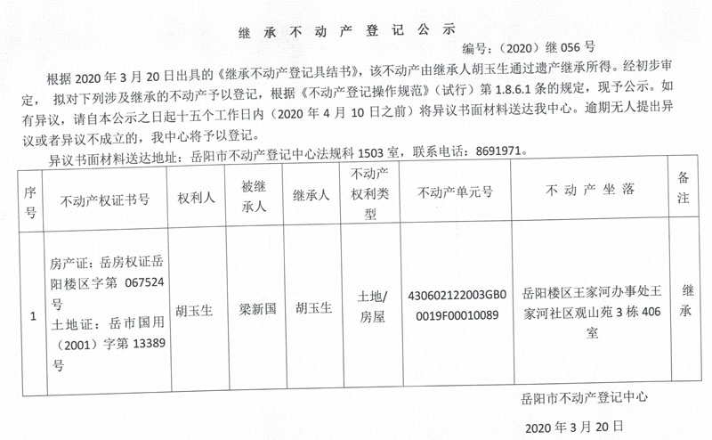 继承(受遗赠)不动产登记公告(胡玉生)