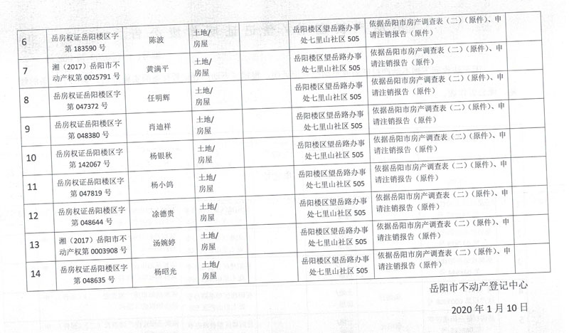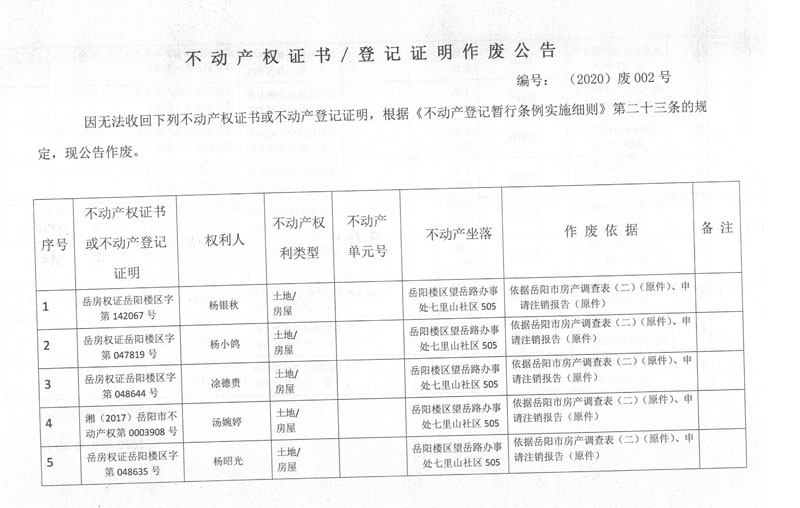 不动产权证书、登记证明作废公告编号(2020)废002(杨银秋、杨小鸽、凃德贵、汤婉婷、杨昭光、陈波、黄满平、任明辉、肖迪祥等七里山拆迁)