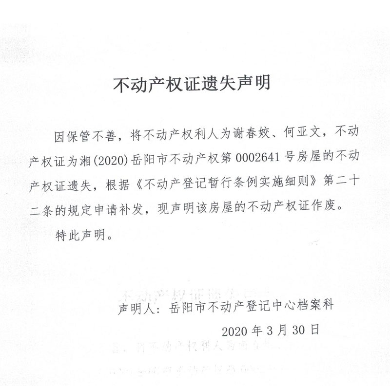 不动产权证遗失声明(谢春姣、何亚文)