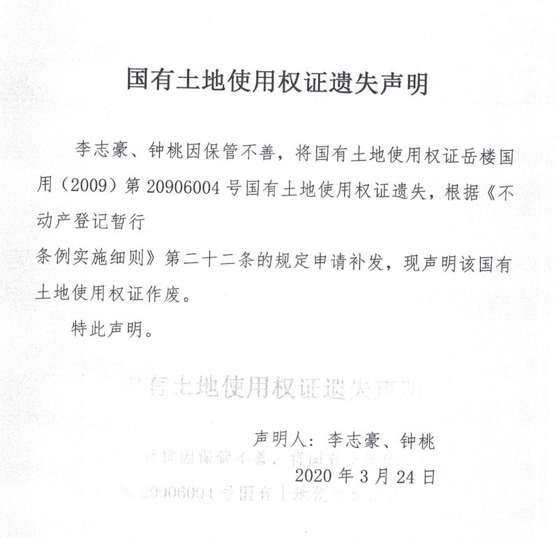 国有土地使用权证遗失声明(李志豪、钟桃)