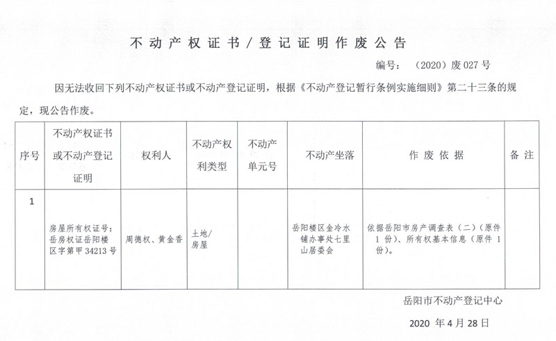 不动产权证书/登记证明作废公告(房屋权人:周德权、黄金香)
