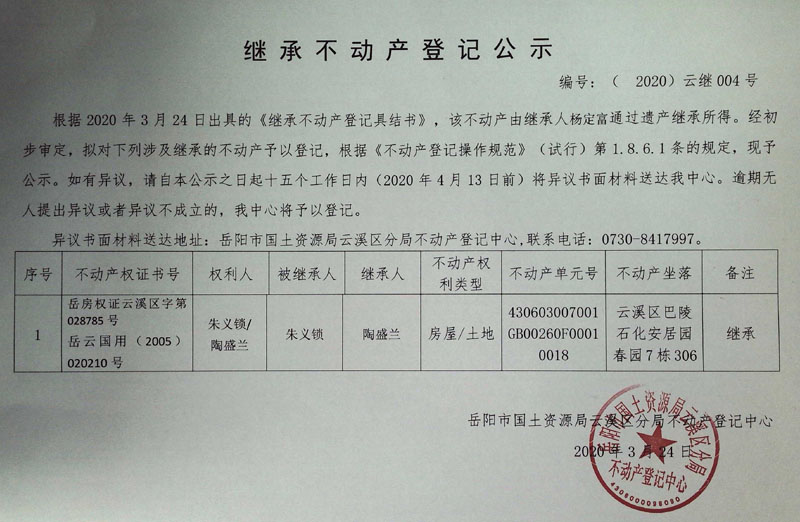 继承(受遗赠)不动产登记公告(朱义锁、陶盛兰)