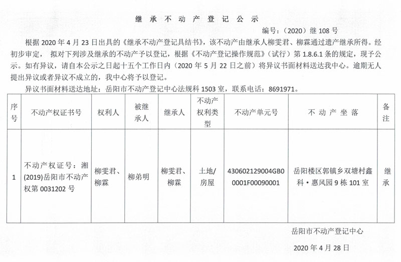 继承(受遗赠)不动产登记公告(柳霖)
