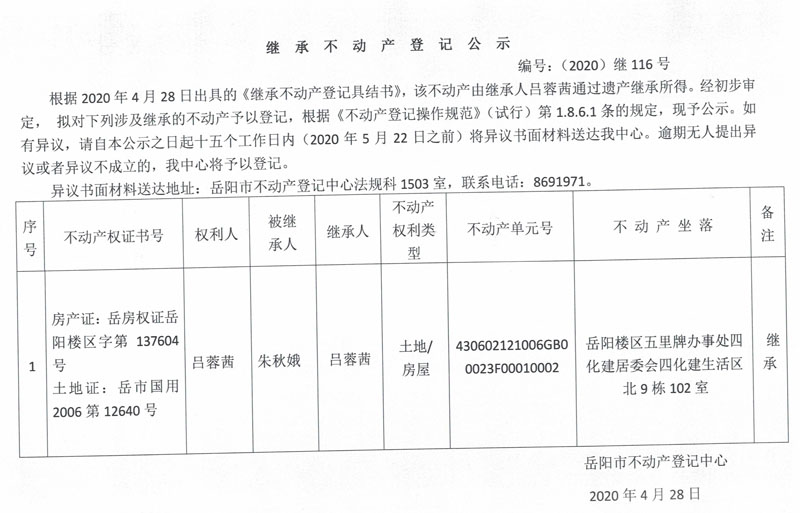 继承(受遗赠)不动产登记公告(吕蓉茜)