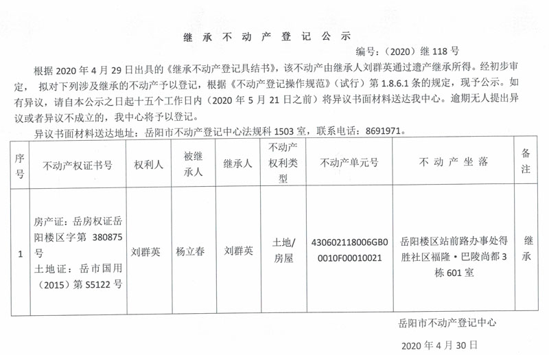 继承(受遗赠)不动产登记公告(刘群英)