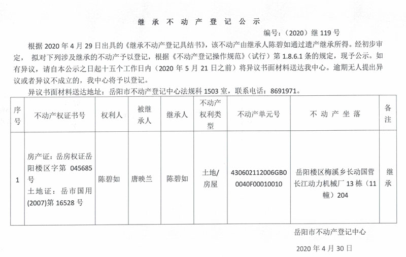 继承(受遗赠)不动产登记公告(陈碧如)