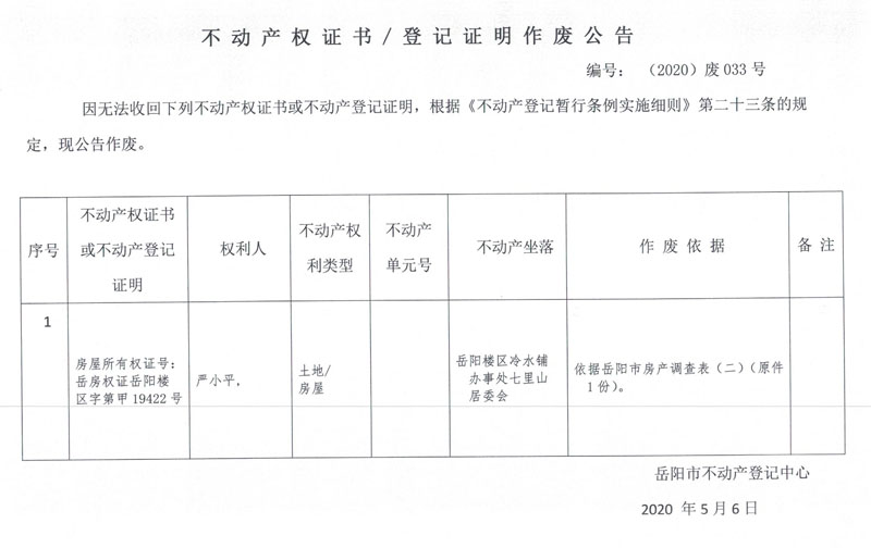 不动产权证书/登记证明作废公告(严小平)